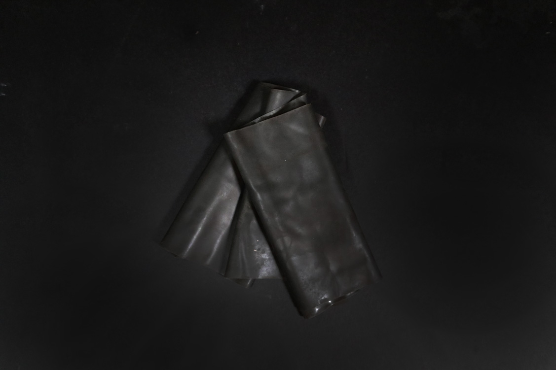 This fragment of rubber reservoir lining represents the impact of the worldwide ban on petrochemical processing (UN Petrochemical Processing Act 2035) the resulting crisis in car tire disposal and indirectly to the founding of the world famous Koussweri University for Global Sustainability.